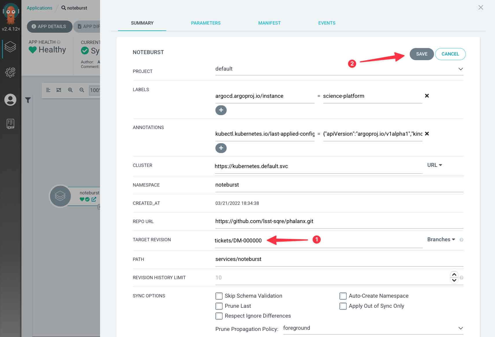 Edits to resources via the Argo CD UI are temporary. To make permanent changes, you need to edit the application’s Helm chart in the phalanx repository.